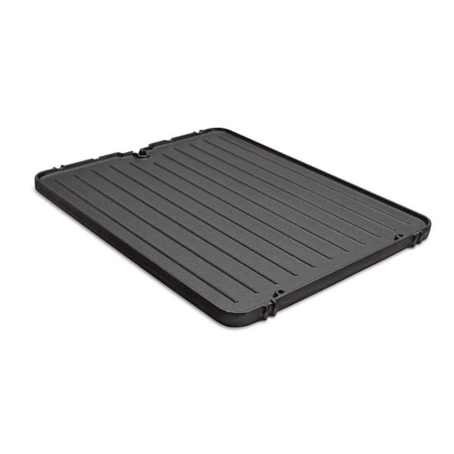 - A reversible griddle; one smooth side for frying while the other side is ribbed for searing.