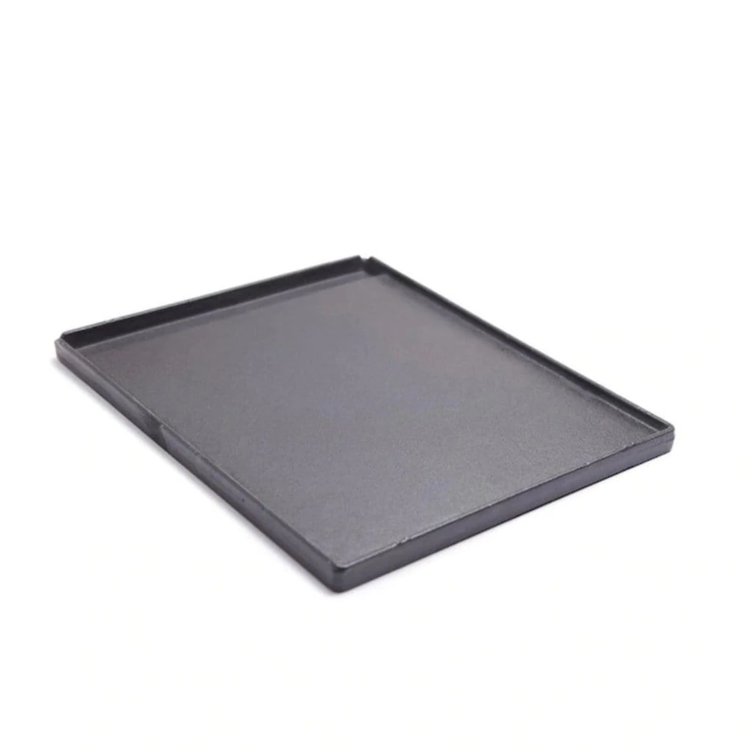 - A heavy-duty cast iron griddle with a matte porcelain coating.