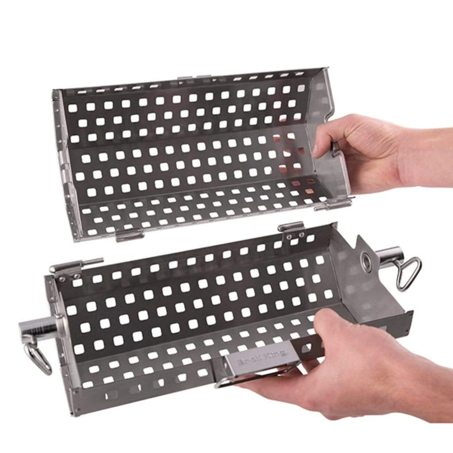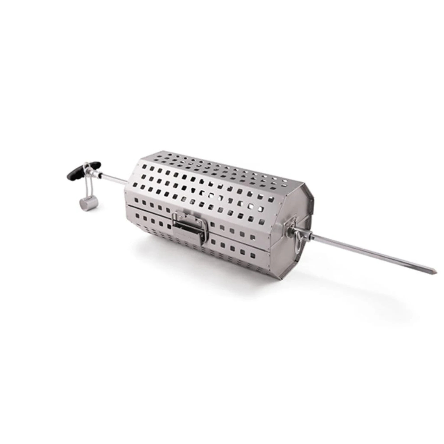 - Perforated stainless steel basket wraps around rotisserie rod.