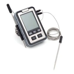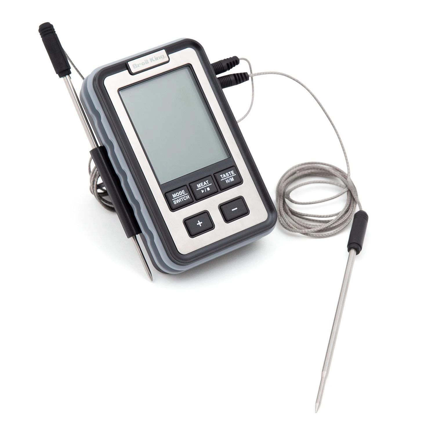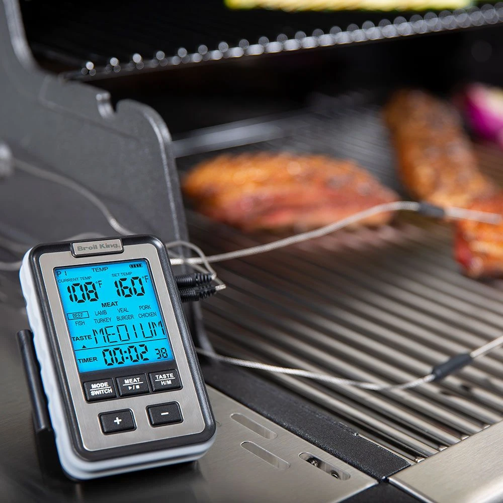 Broil King 61935 Side Table Thermometer offers a premium accessory for use with your grill. This convenient thermometer monitors your entire cooking process from outside the grill. The side-table thermometer’s two probes enable you to simultaneously monitor the internal temperature for a cut of meat and the ambient grill temperature without opening your grill to check inside and losing retained heat. This unit has an integrated countdown timer and a wide range of target doneness levels for each cut of meat–or you can set your own target. This thermometer features an operating temperature range of -58 degrees to +572 degrees Fahrenheit.